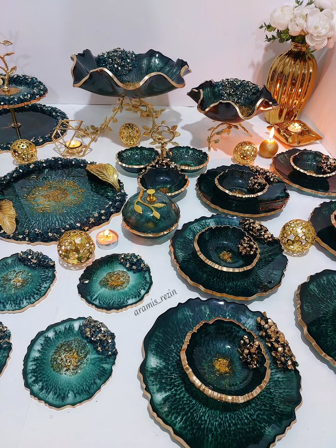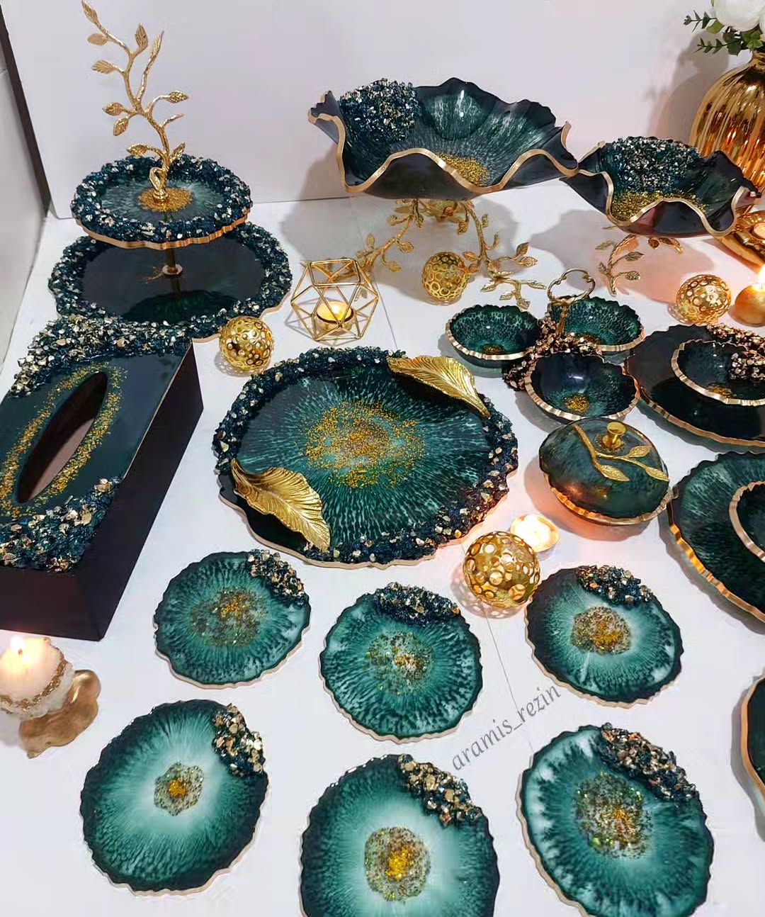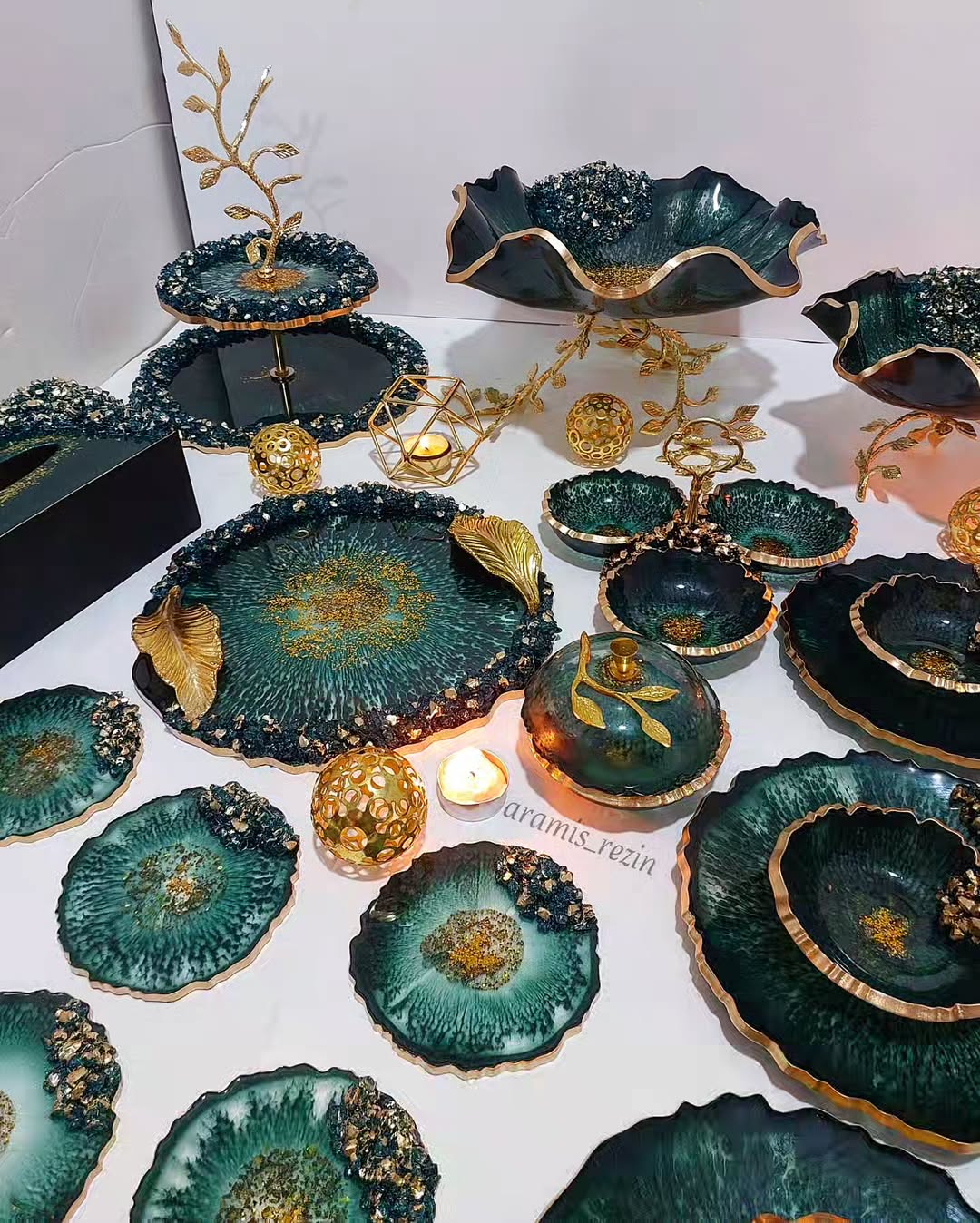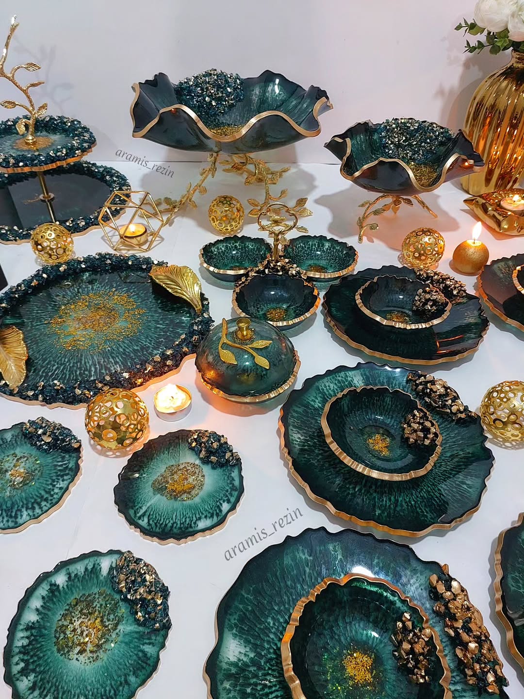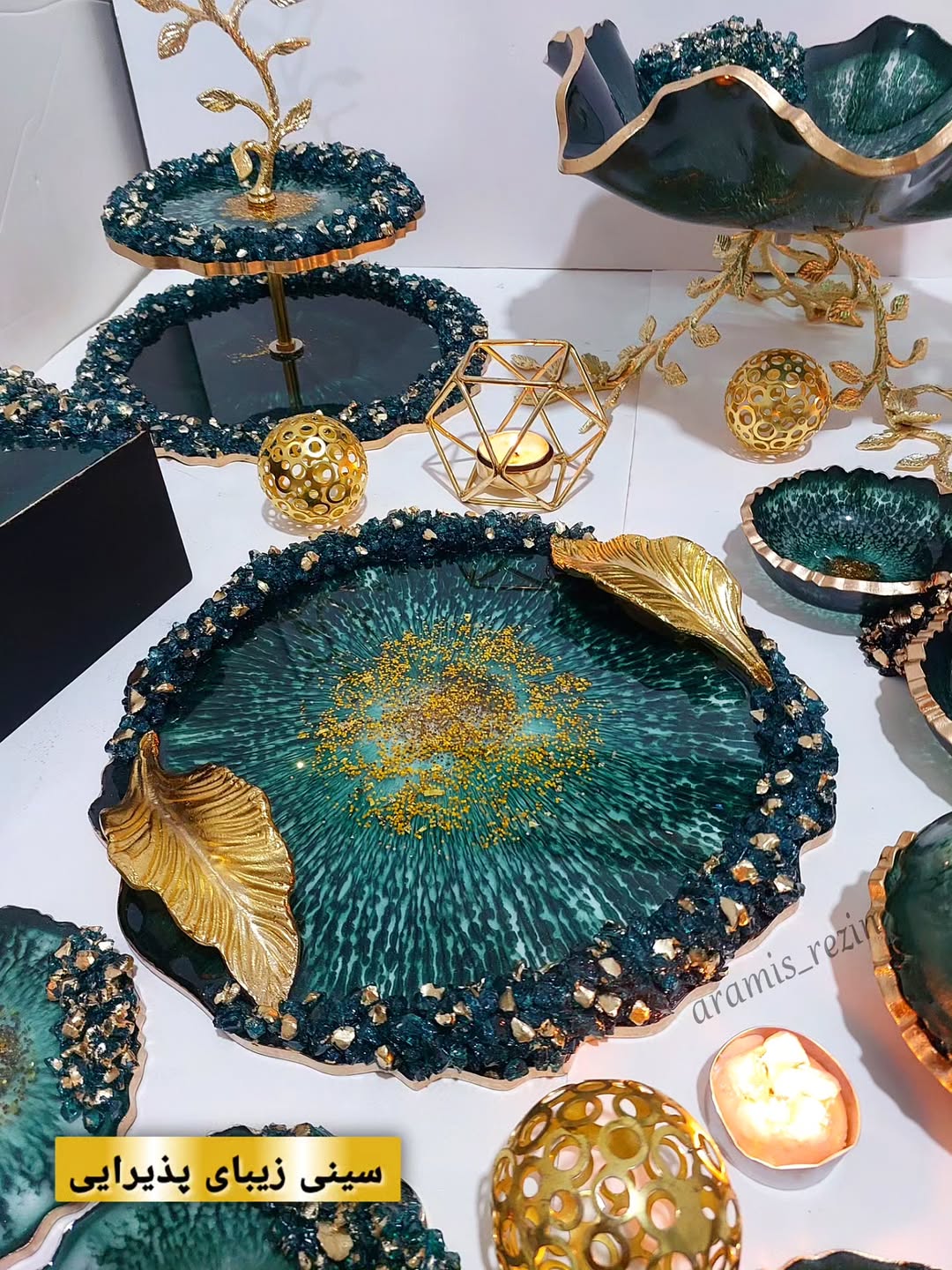 سرویس پذیرایی سبز و طلایی طرح یاقوت جنس رزینی