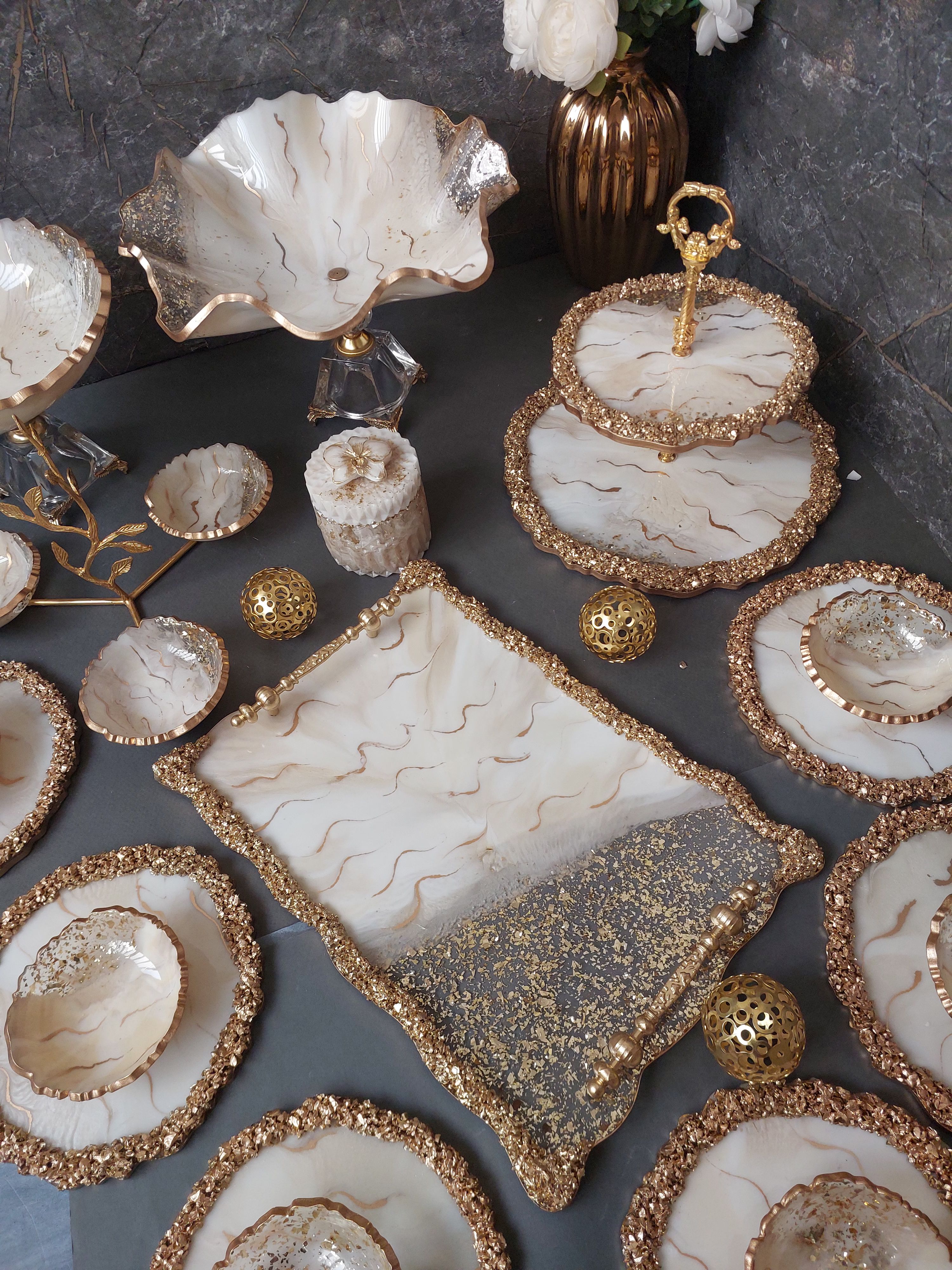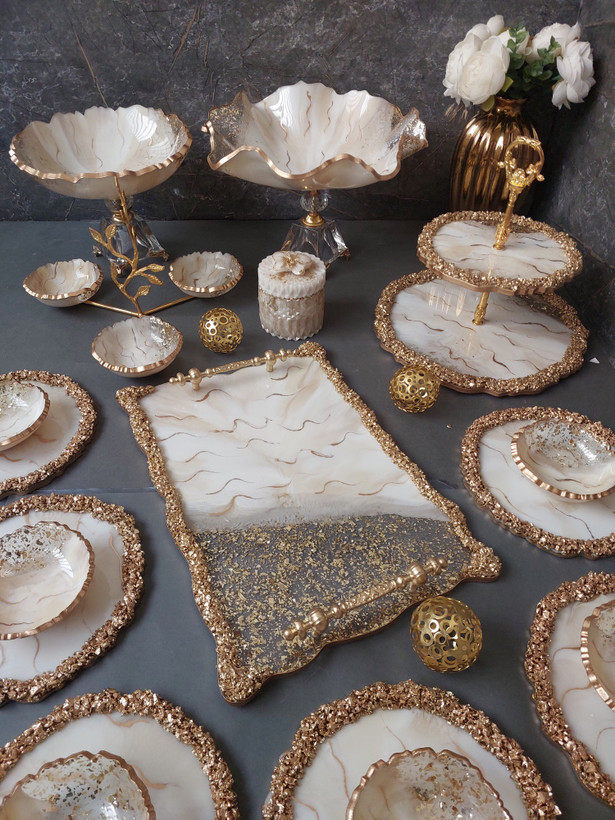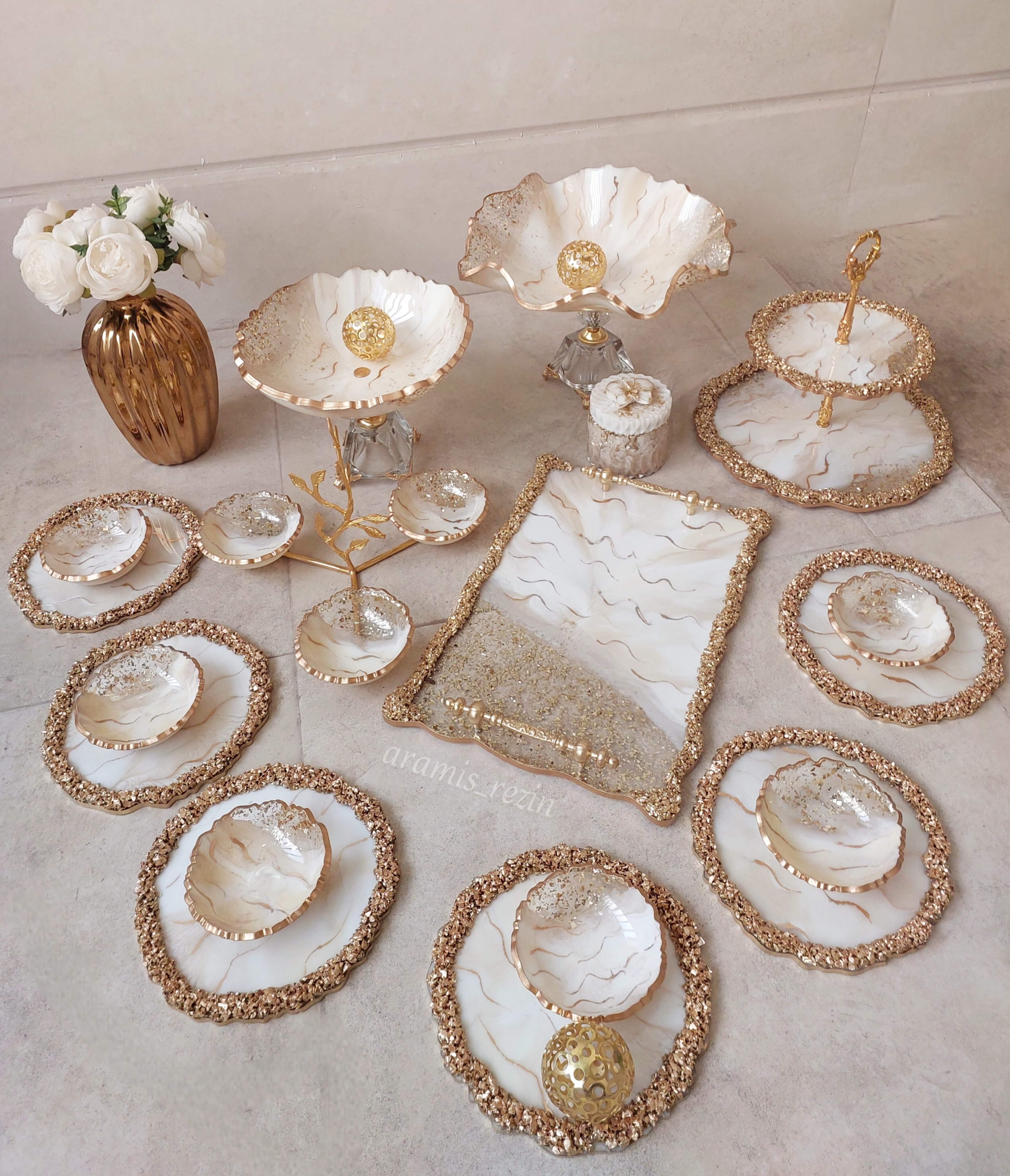 سرویس ظروف پذیرایی ماربل کرم طلایی رزینی ویژه جهیزیه جنس رزین اپوکسی قابل شستشو کاملا کاربردی قابل سفارش در آیتم و تعداد دلخواه
