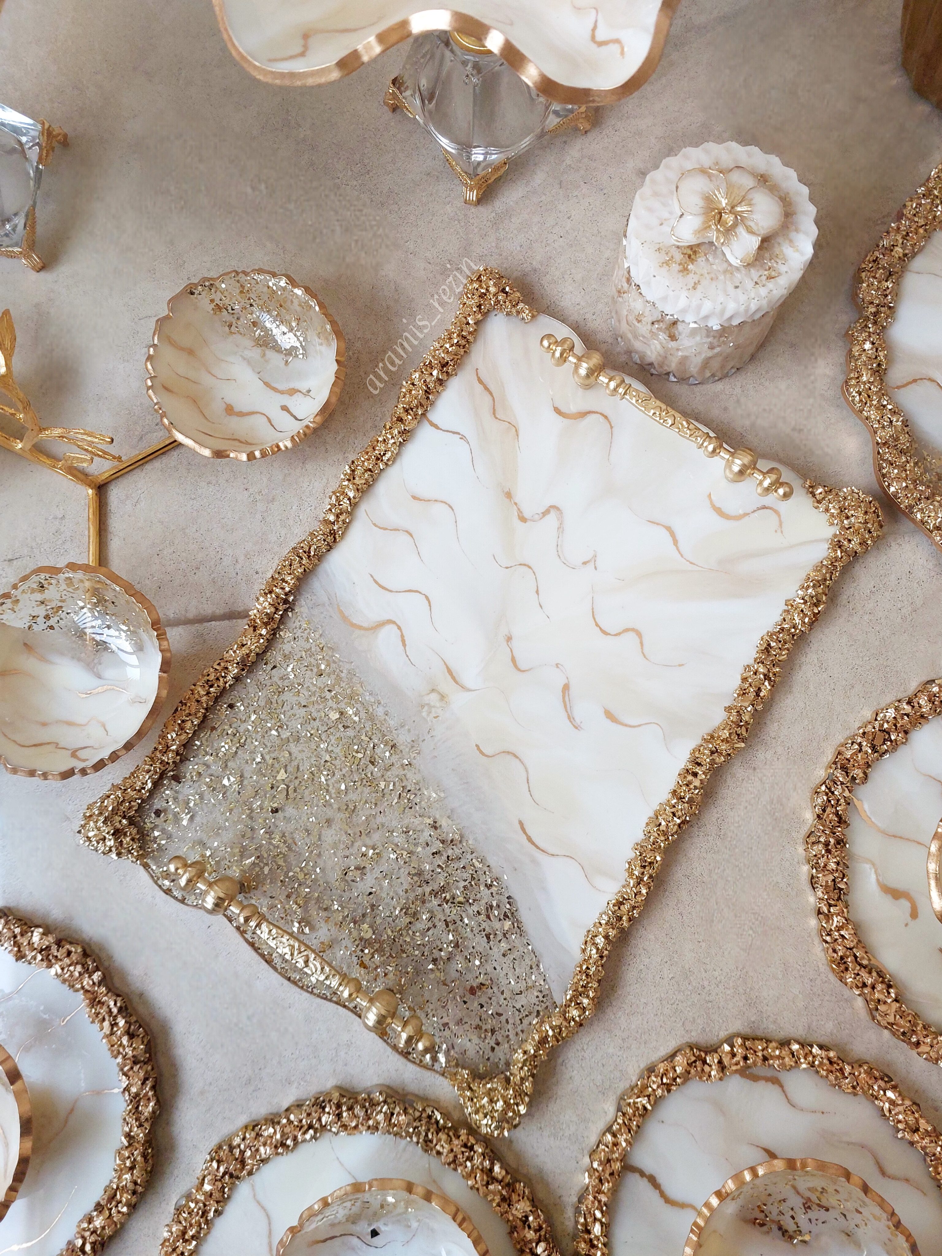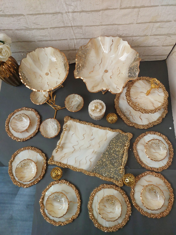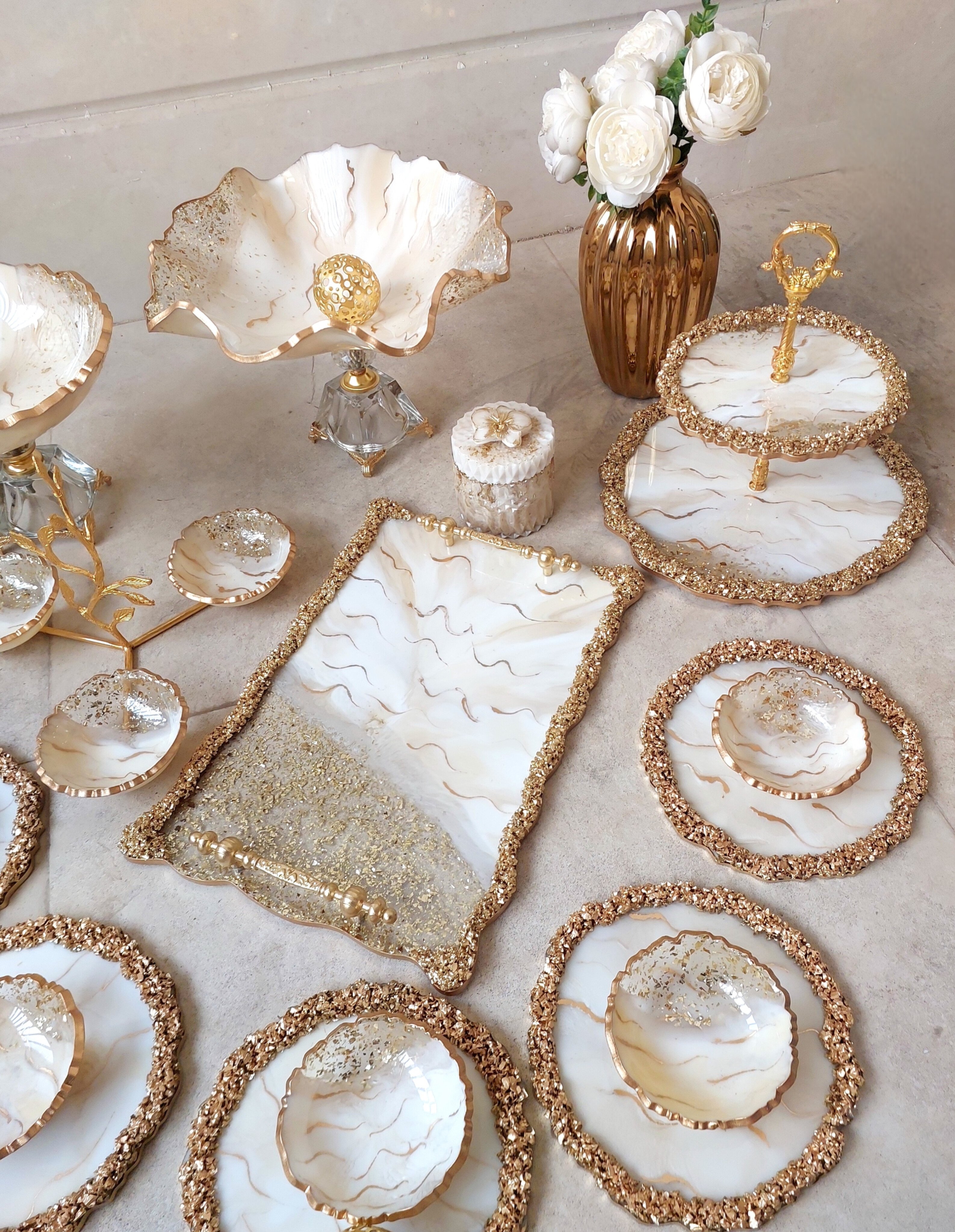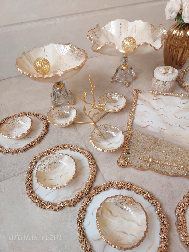 سرویس ظروف پذیرایی ماربل کرم طلایی رزینی ویژه جهیزیه جنس رزین اپوکسی قابل شستشو کاملا کاربردی قابل سفارش در آیتم و تعداد دلخواه