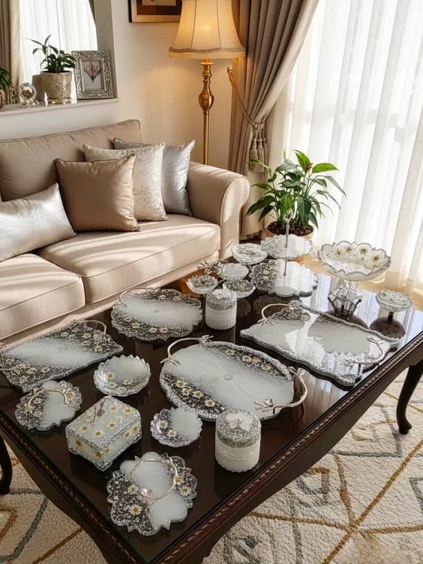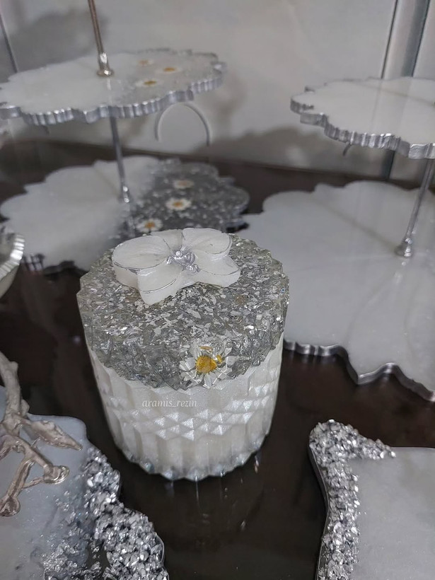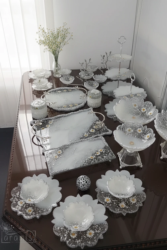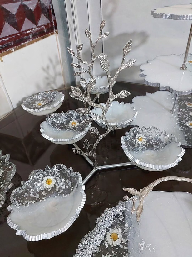 سرویس عروس کار شده با ورق نقره و بابونه.جنس رزین اپوکسی