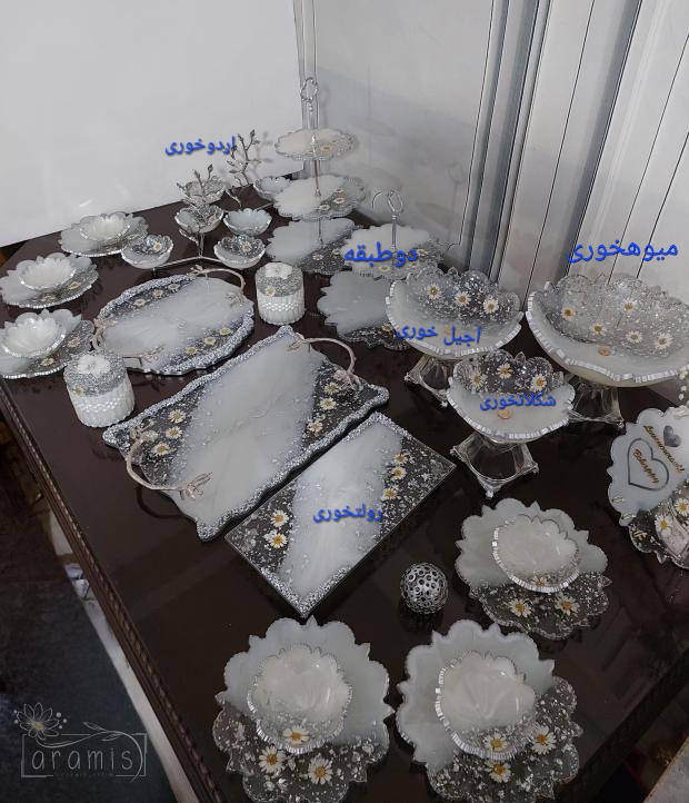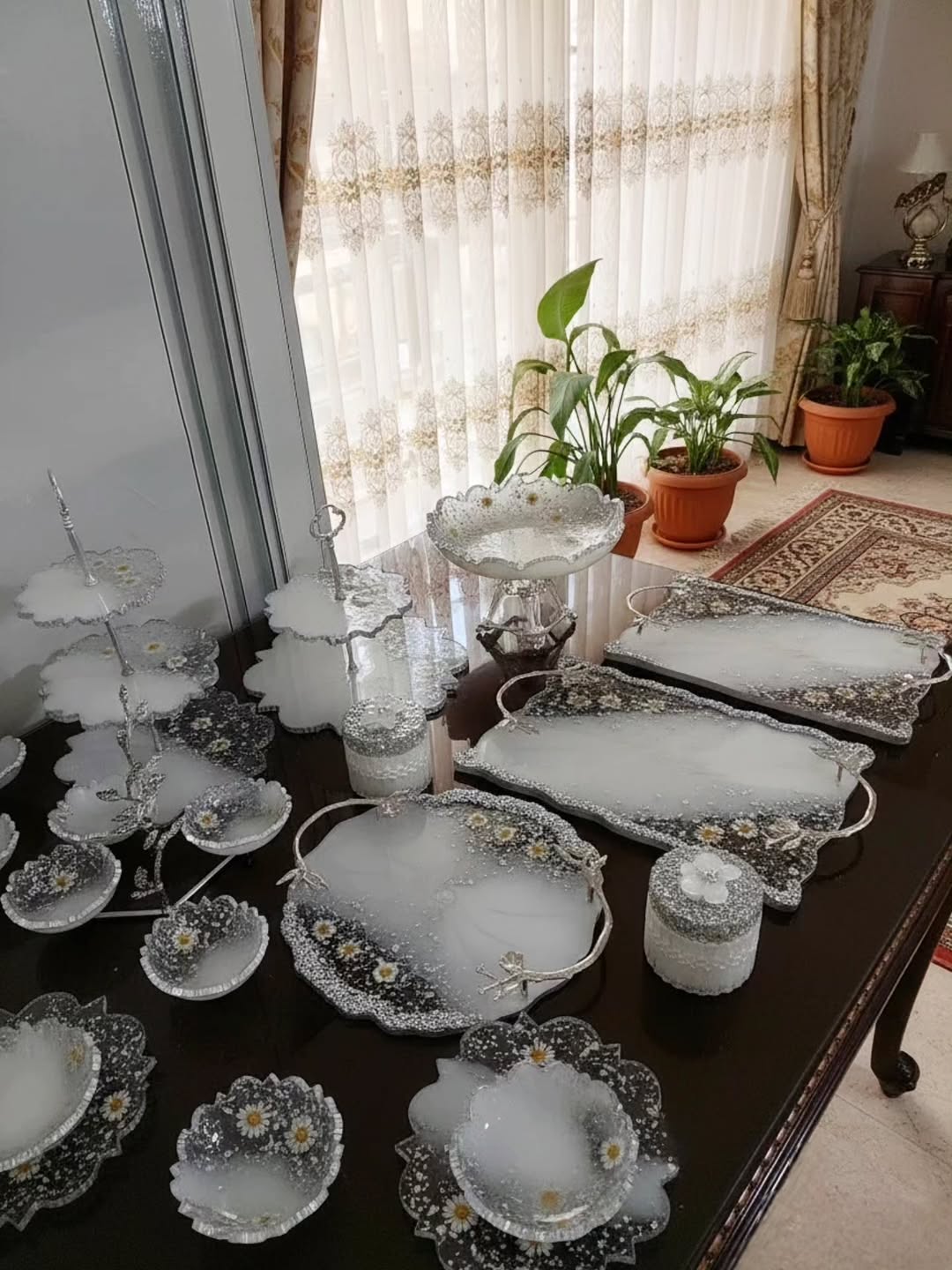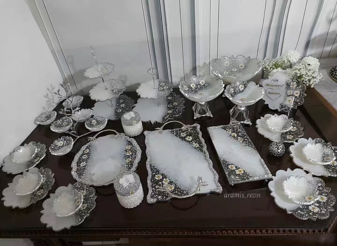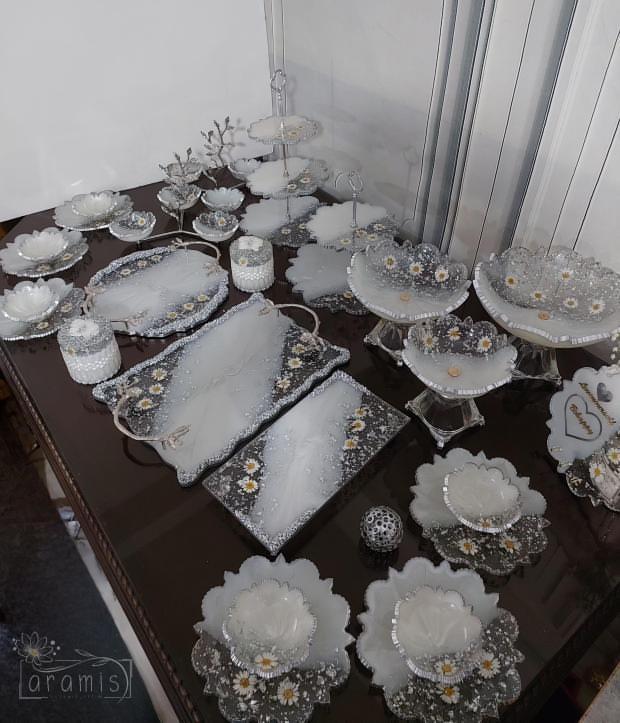 سرویس عروس کار شده با ورق نقره و بابونه.جنس رزین اپوکسی