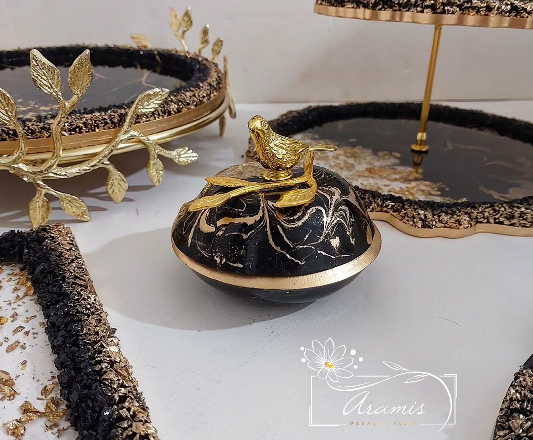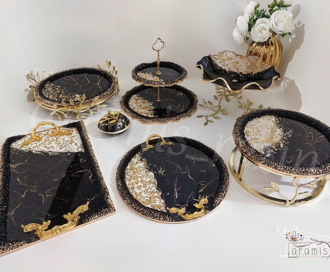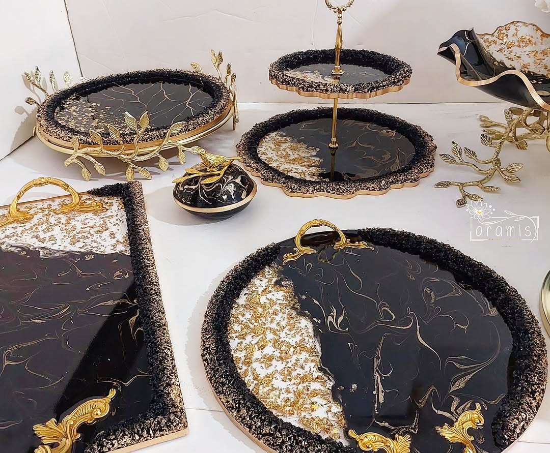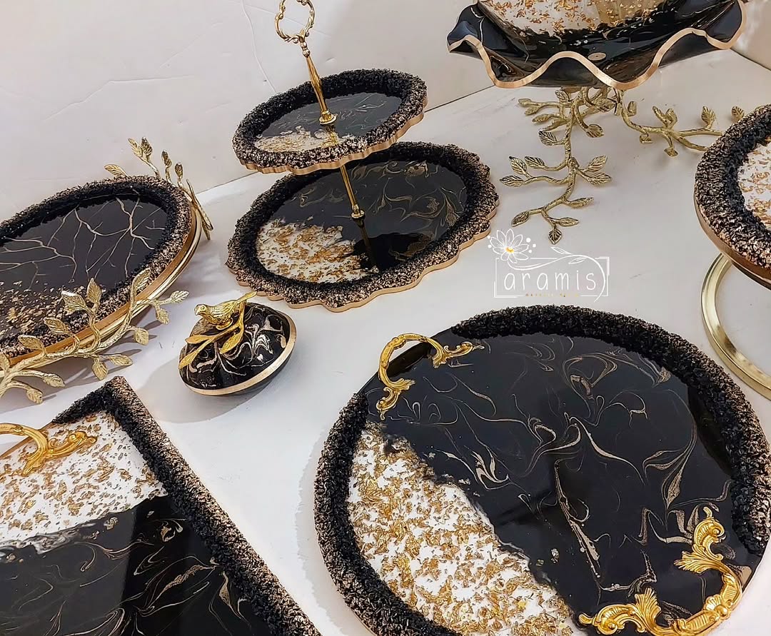 شیرینی خوری دوطبقه۹۵۰ میوهخوری پایه برگ۱،۳۰۰ سینی مستطیل۹۵۰ سینی دایره۹۰۰ استند رینگ برگ۱،۴۰۰ استند پایه بلند برگ۱،۲۰۰ قندون۳۵۰ کارها سفارشی هستند،سفارش بدید براتون مجدد ساخته میشه جنس رزین اپوکسی قابل در ابعاد و تعداد دلخواه قابل شستشو و تا۸۰درصد نشکن سبک