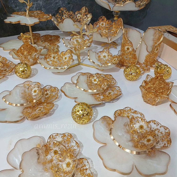 سرویس ظروف پذیرایی رزینی ورق طلا بابونه طرح نازگل