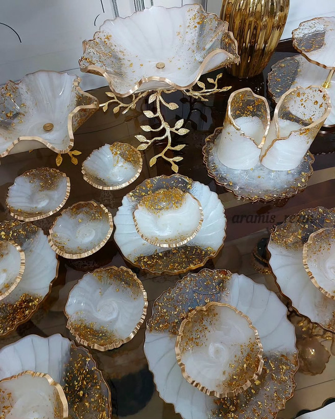 جنس رزین اپوکسی میتونید با مبلمان و پرده و فرش و کلا دکوراسیون خونه و تالار ست کنید میتونید تو رنگ نقره ای ورق نقره هم سفارش بدید میوهخوری پایه برگ ۱۳۵۰ اجیلخوری پایه برگ ۸۵۰ شکلاتخوری پایه برگ۷۵۰ دوطبقه دسته برگ ۱،۱۰۰ جاقاشقی دسته برگ۹۵۰ ۶عدد پیشدستی ۱،۶۰۰ ۶عدد پیاله۱،۱۰۰ ویژه بانوان خانه دار شیک پسندو جهیزیه عروس خانمها