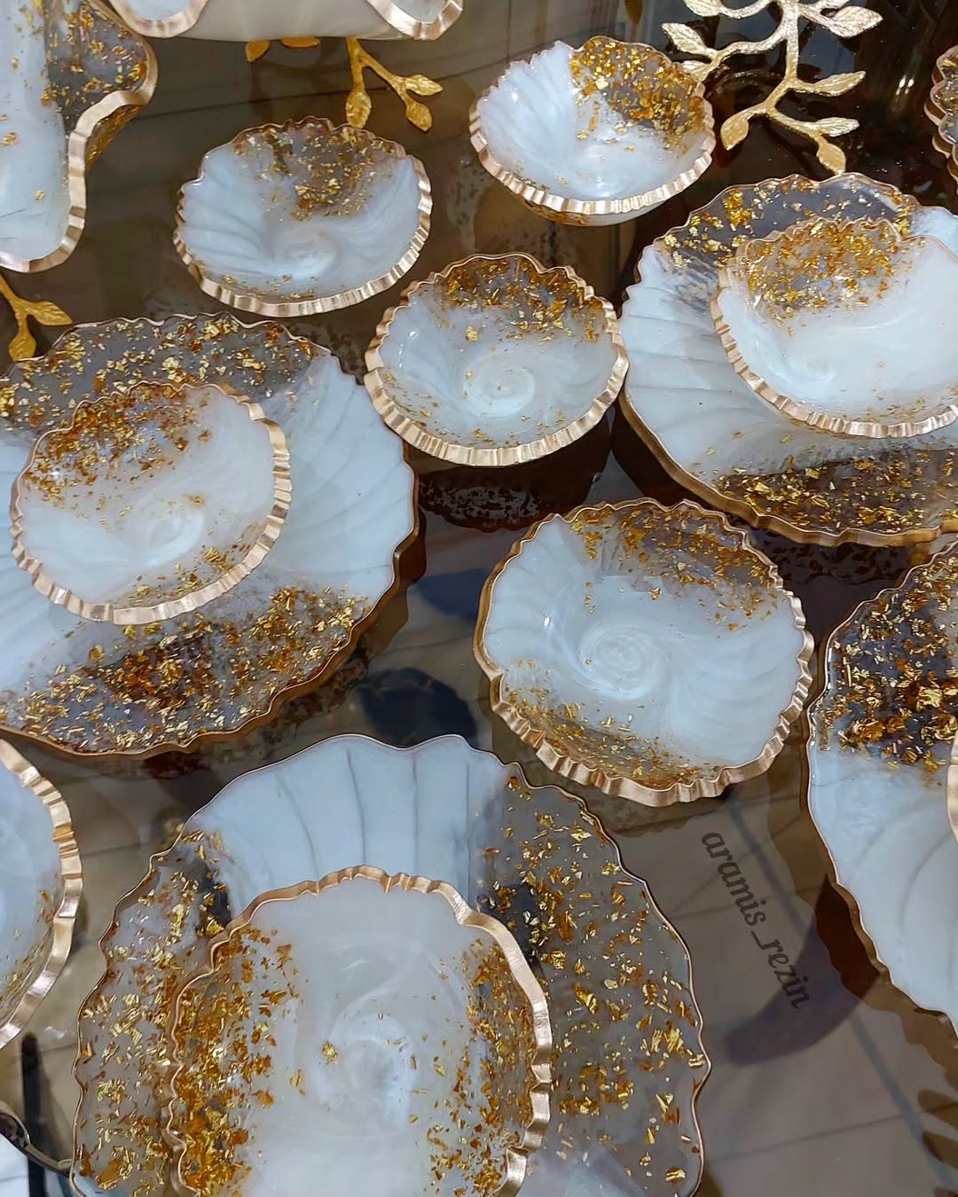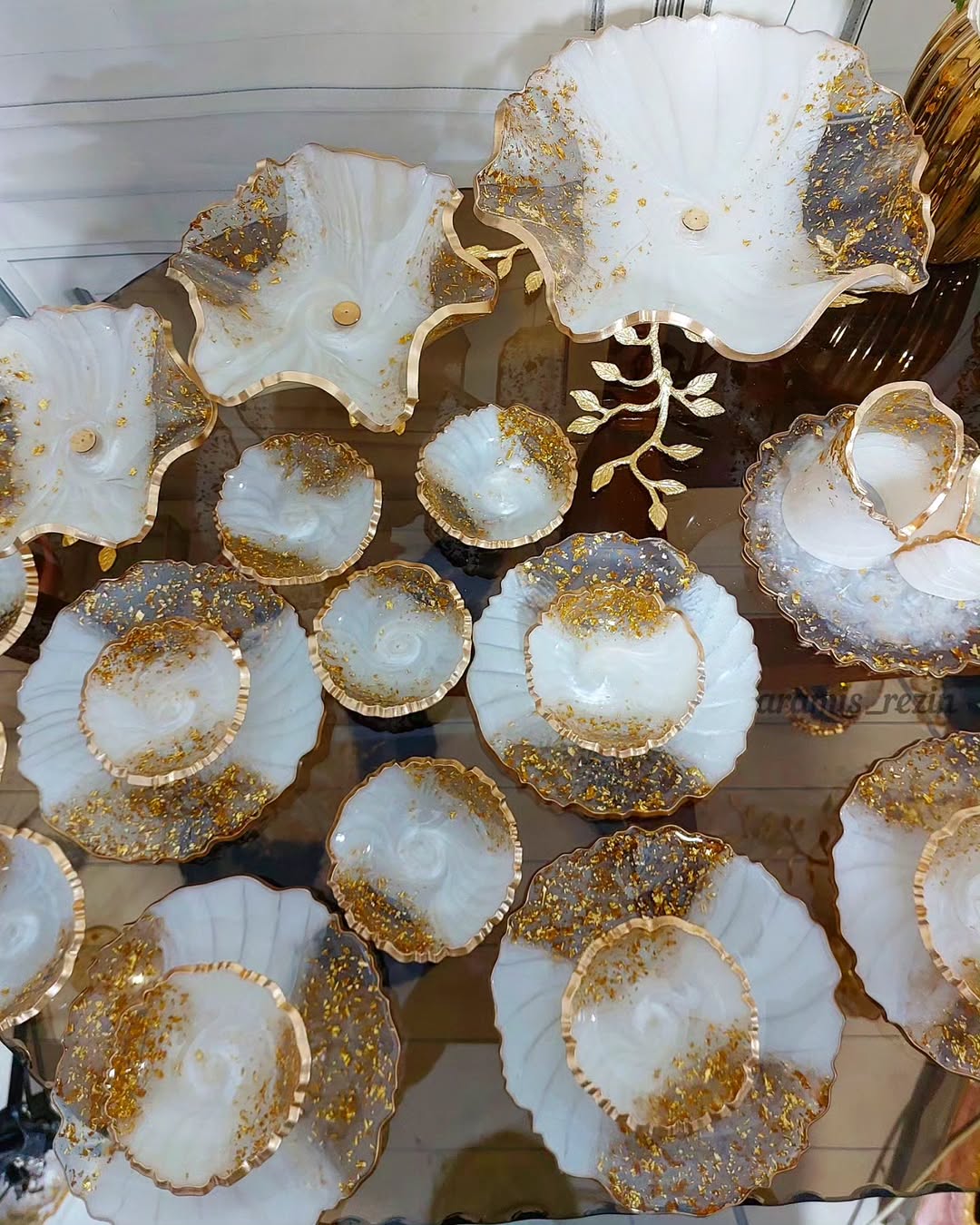 جنس رزین اپوکسی میتونید با مبلمان و پرده و فرش و کلا دکوراسیون خونه و تالار ست کنید میتونید تو رنگ نقره ای ورق نقره هم سفارش بدید میوهخوری پایه برگ ۱۳۵۰ اجیلخوری پایه برگ ۸۵۰ شکلاتخوری پایه برگ۷۵۰ دوطبقه دسته برگ ۱،۱۰۰ جاقاشقی دسته برگ۹۵۰ ۶عدد پیشدستی ۱،۶۰۰ ۶عدد پیاله۱،۱۰۰ ویژه بانوان خانه دار شیک پسندو جهیزیه عروس خانمها