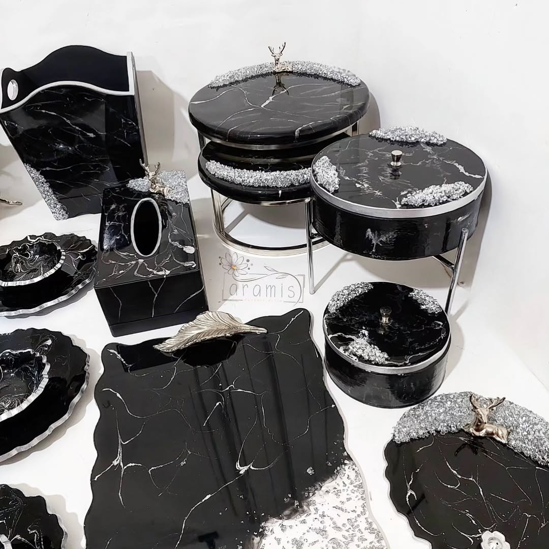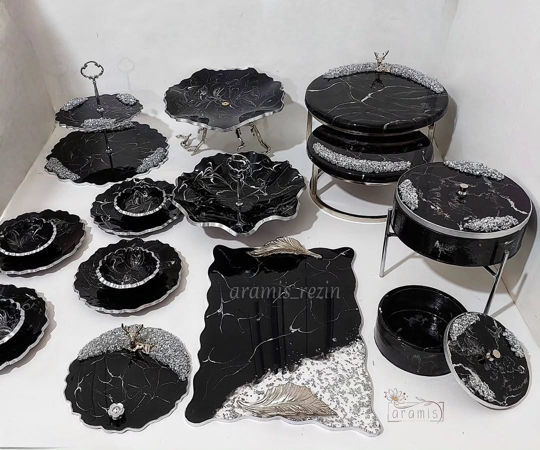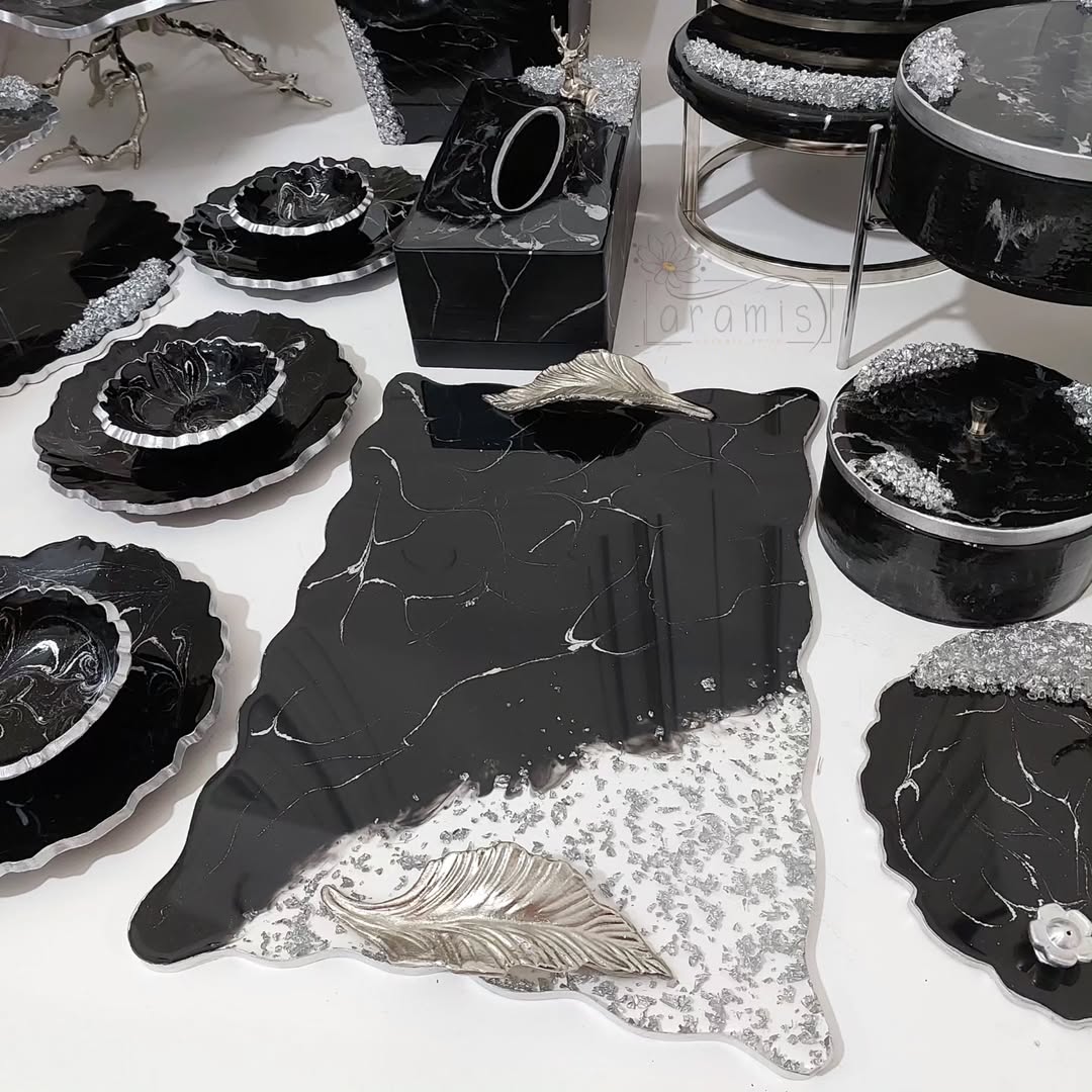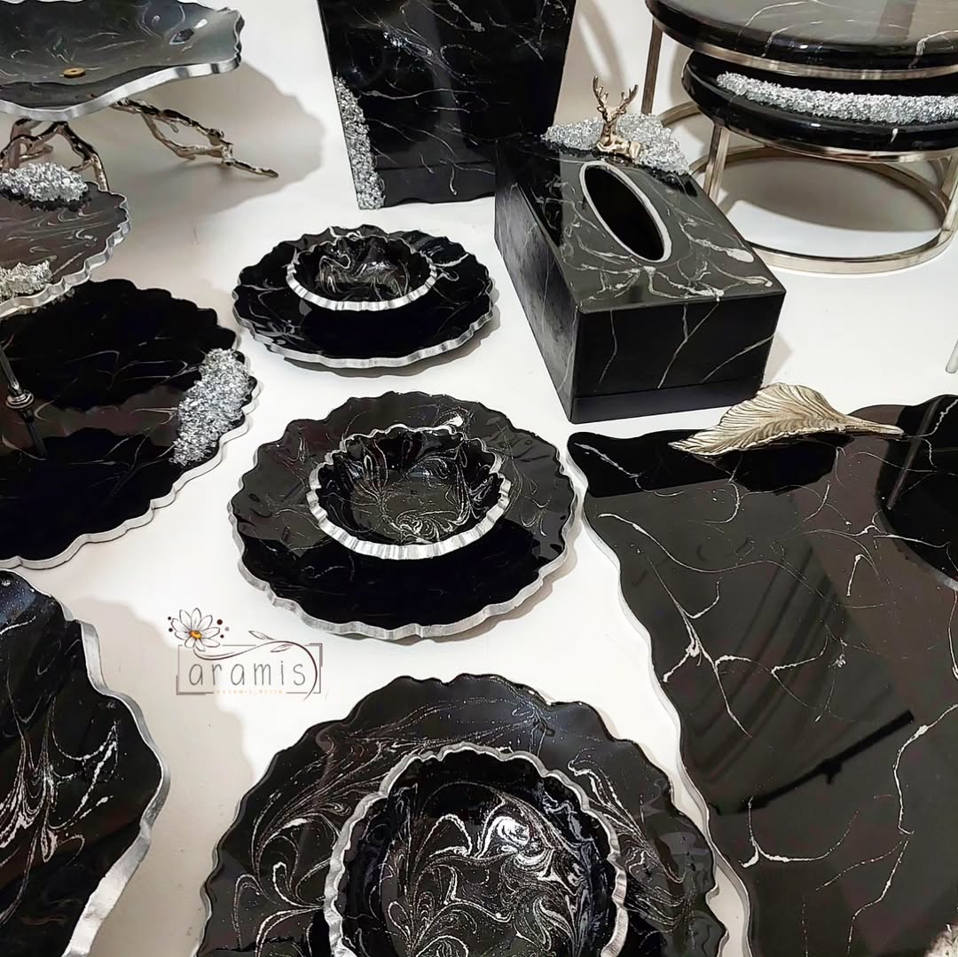 سرویس ظروف پذیرایی رزینی مشکی نقره ای طرح ماربل رگه دار