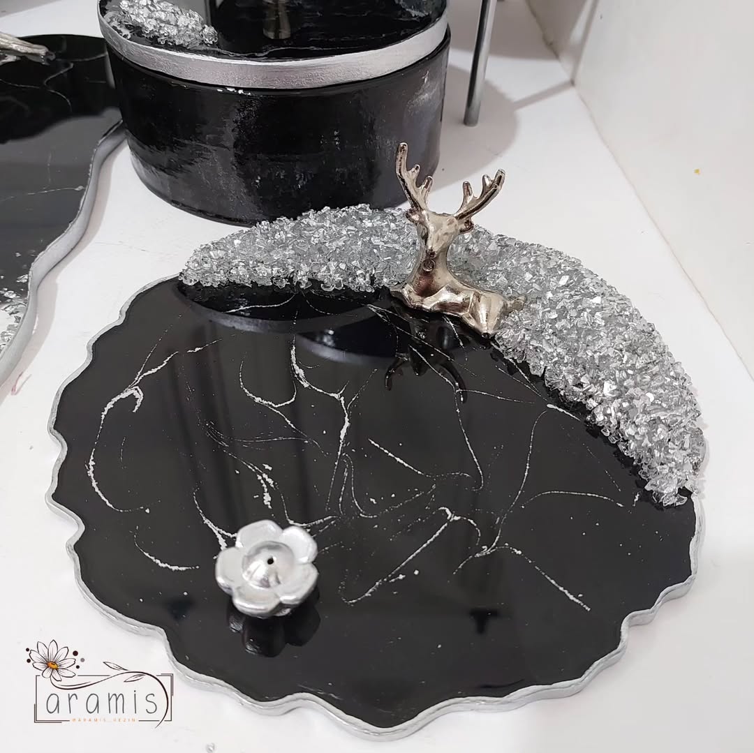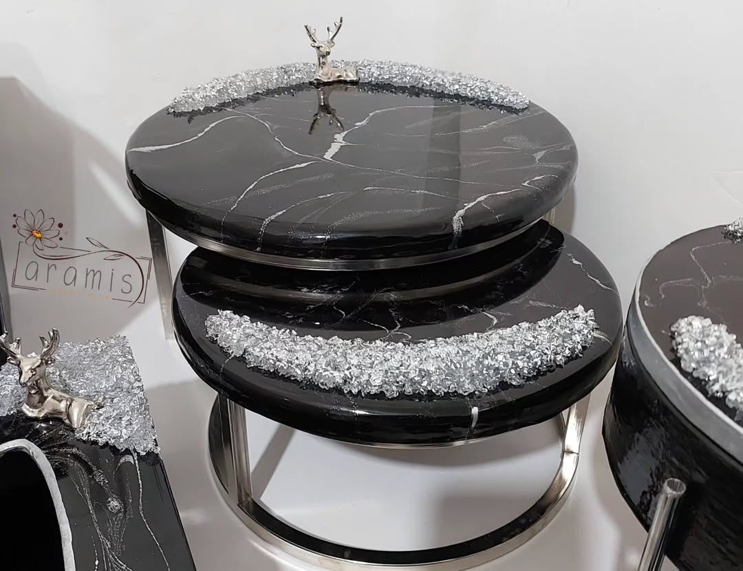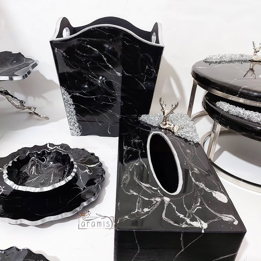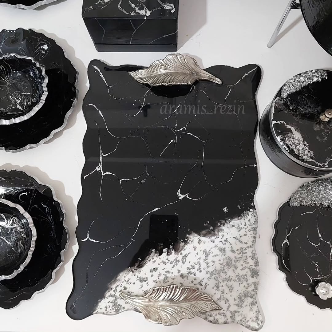 سرویس ظروف پذیرایی رزینی مشکی نقره ای طرح ماربل رگه دار