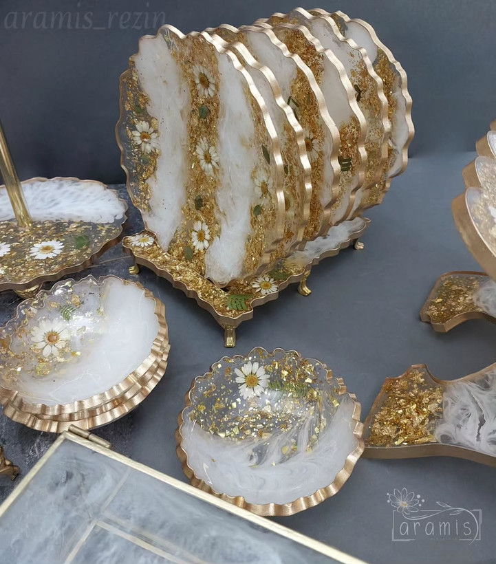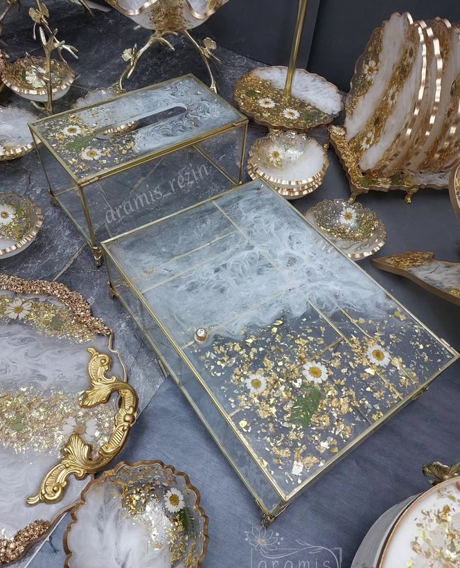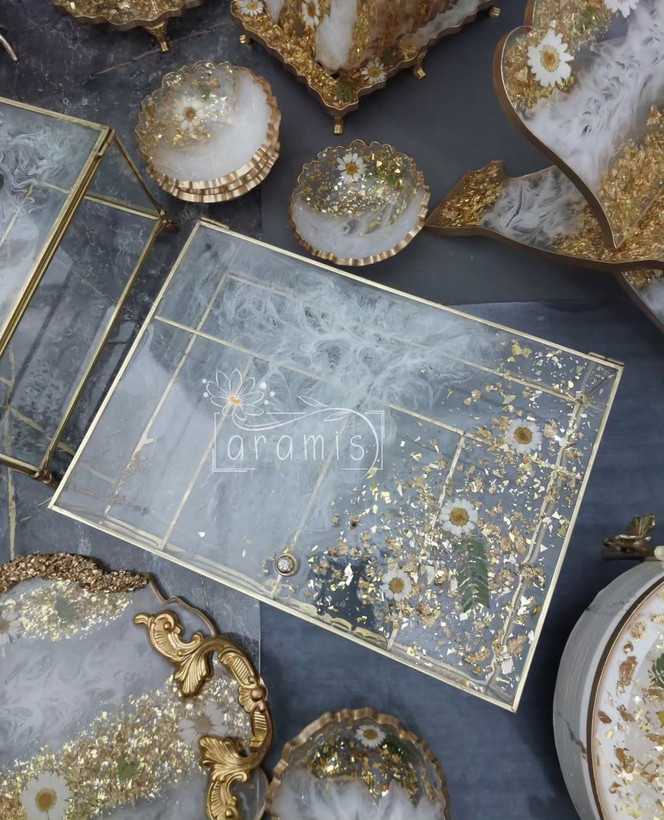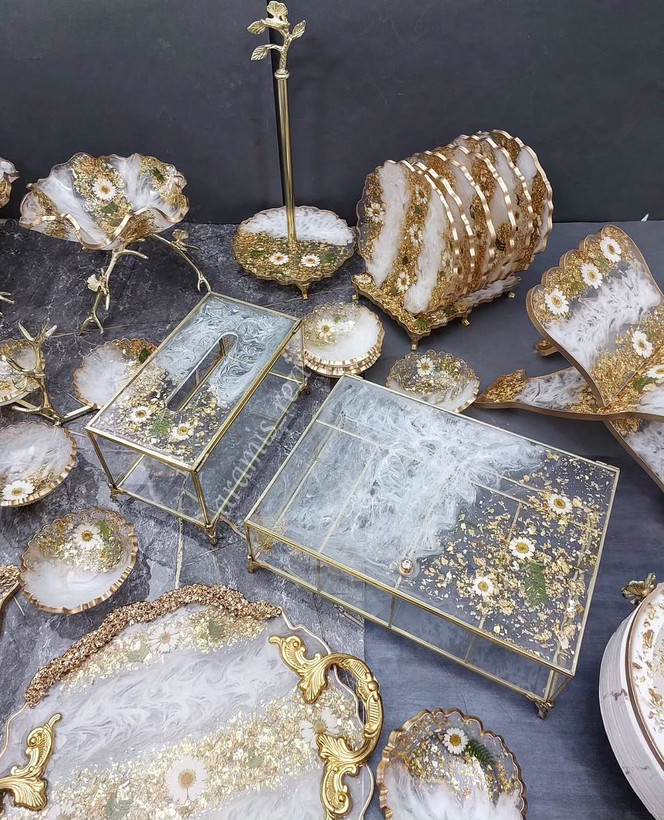 سینی مستطیل سینی دایره میوه خوری اجیلخوری اردوخوری استند رینگ شاخ جادستمالی رولی جعبه دستمال رحل قرآن ۶عدد پیشدستی استند پیشدستی ۶عدد پیاله جعبه تیبگ شکلات خوری در دار جنس رزین اپوکسی قابل شستشو و تا۸۰درصد نشکن سبک