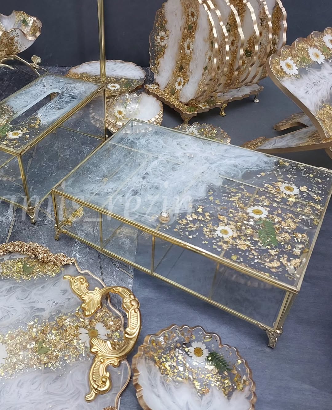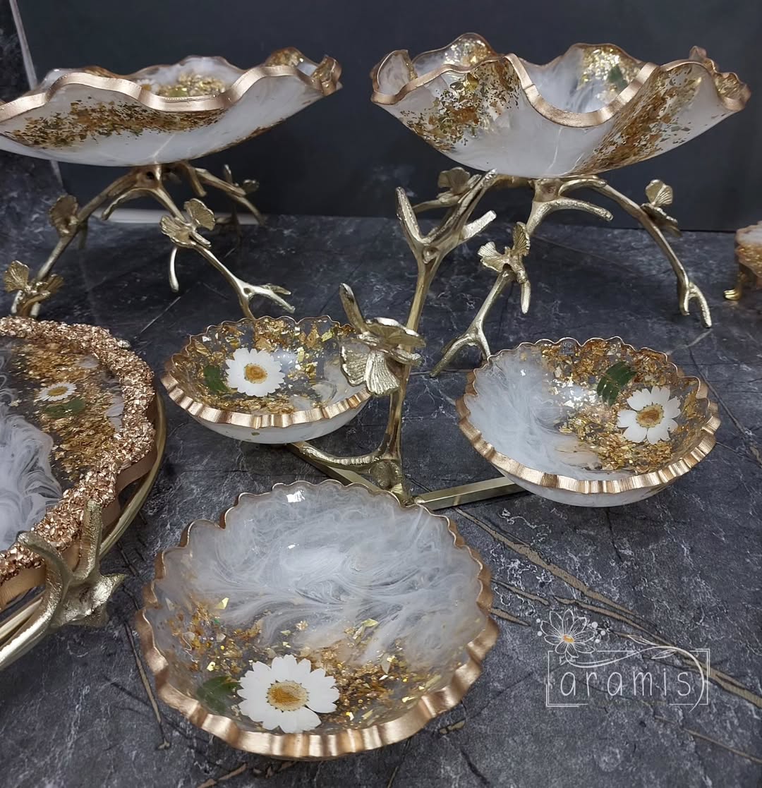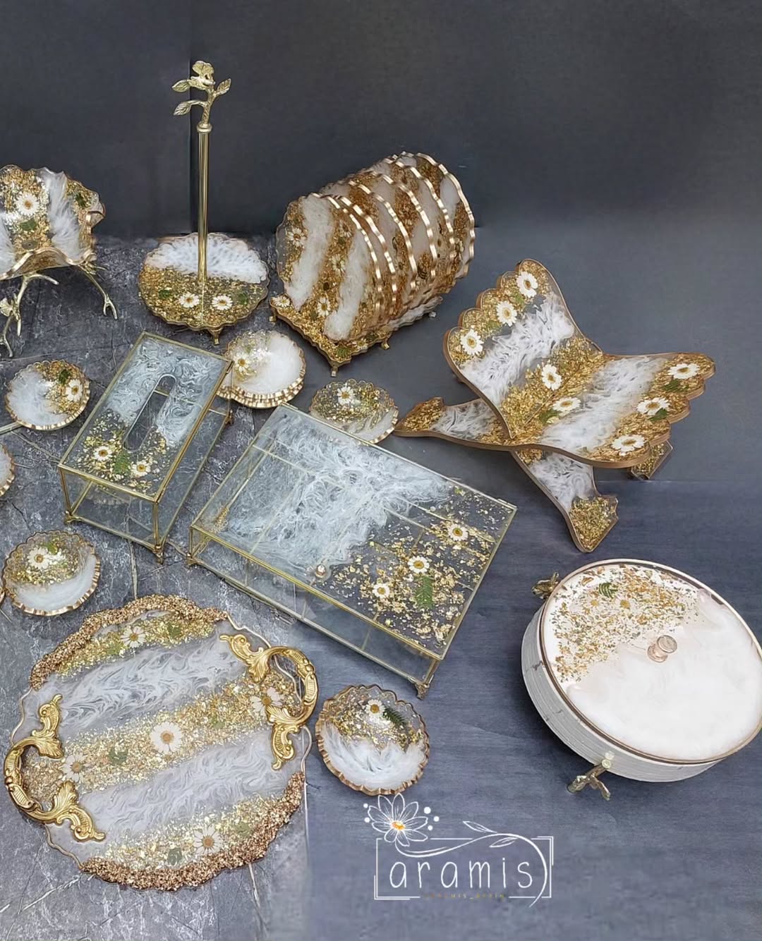 سینی مستطیل سینی دایره میوه خوری اجیلخوری اردوخوری استند رینگ شاخ جادستمالی رولی جعبه دستمال رحل قرآن ۶عدد پیشدستی استند پیشدستی ۶عدد پیاله جعبه تیبگ شکلات خوری در دار جنس رزین اپوکسی قابل شستشو و تا۸۰درصد نشکن سبک