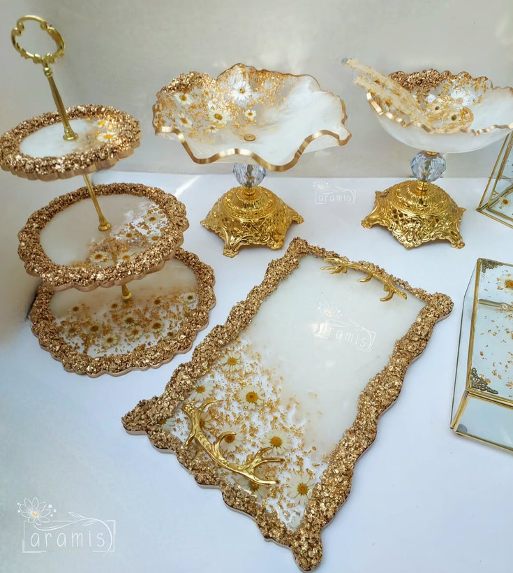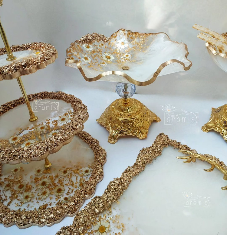 ست چهارتیکه میوه خوری ۹۲۰ اجیلخوری ۸۵۰ شیرینی خوری سه طبقه طبقه ۱،۱۵۰ سینی۹۵۰ جنس رزین اپوکسی قابل شستشو کار شده با گل طبیعی ارسال به همه جا #ظروف_تزئینی#ظروف_رزینی#ظروف_بابونه#بابونه_رزینی
