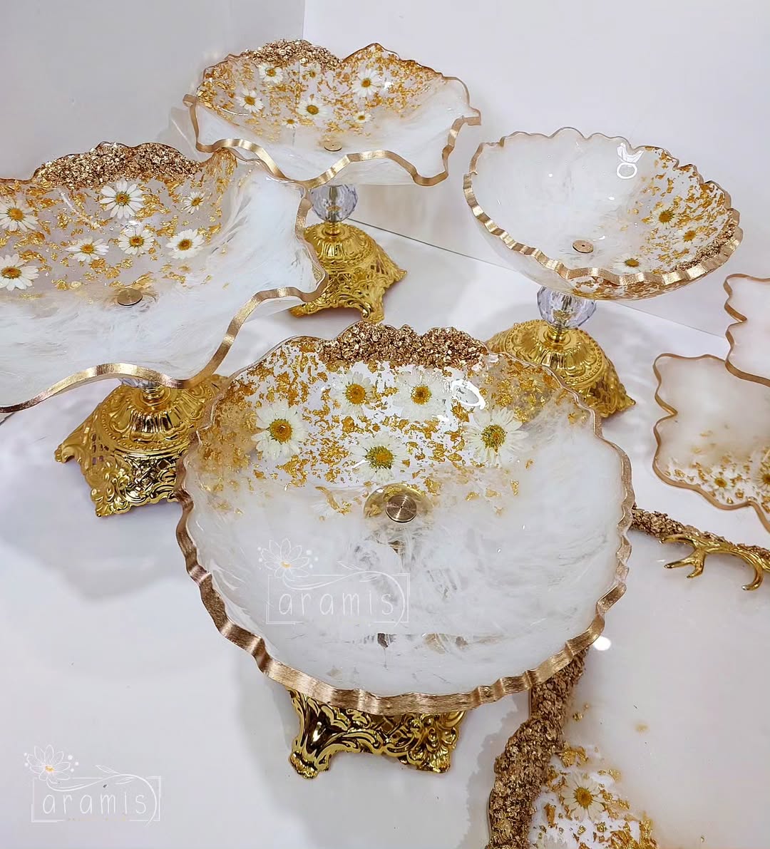 ست چهارتیکه میوه خوری ۹۲۰ اجیلخوری ۸۵۰ شیرینی خوری سه طبقه طبقه ۱،۱۵۰ سینی۹۵۰ جنس رزین اپوکسی قابل شستشو کار شده با گل طبیعی ارسال به همه جا #ظروف_تزئینی#ظروف_رزینی#ظروف_بابونه#بابونه_رزینی