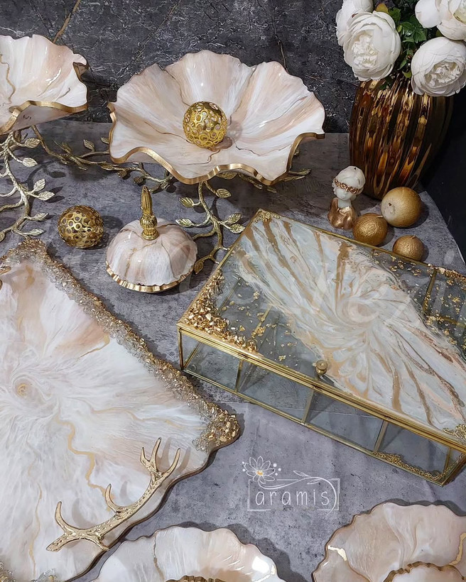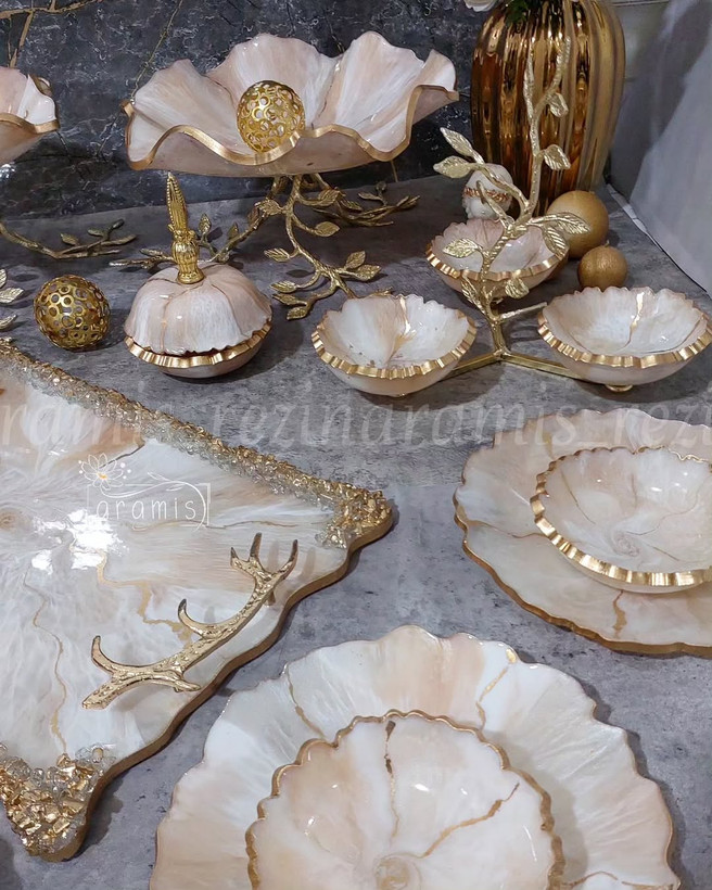 سینی ۹۰۰ شش عدد پیش دستی۱،۵۰۰ شش عدد پیاله ۹۵۰ دوطبقه ۹۰۰ میوهخوری پایه برگ ۱،۳۰۰ اجیلخوری پایه برگ ۱،۲۰۰ جاقاشقی دو قلو۹۵۰ اردوخوری۹۰۰ تیبگ شیشه ای ۹۰۰ قندون هدیه جهت کارها سفارشی هستند،اماده بدید مجدد براتون اماده میشه جنس رزین اپوکسی قابل در ابعاد و تعداد دلخواه قابل شستشو و تا۸۰درصد نشکن سبک