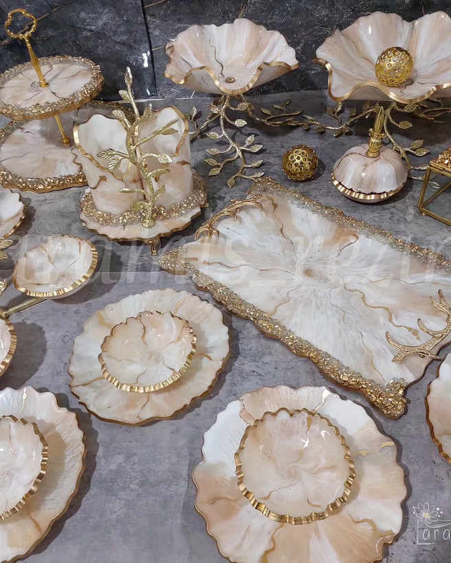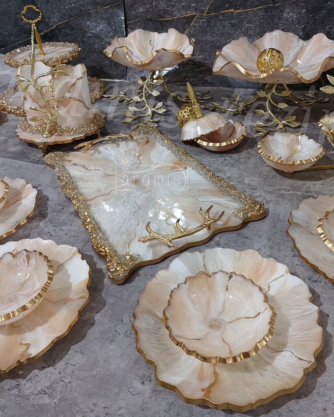 ظروف پذیرایی رزینی ماربل کرم طلایی