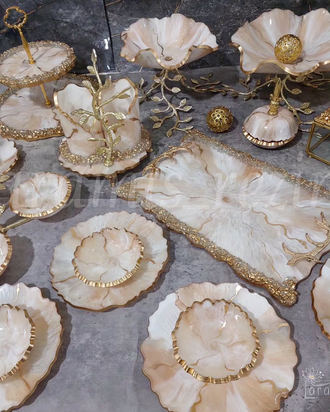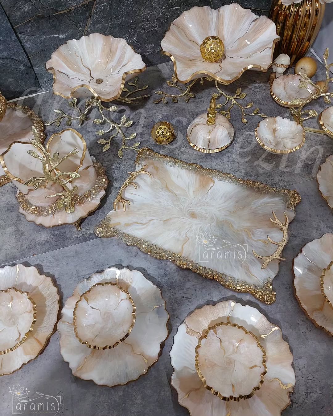 سینی ۹۰۰ شش عدد پیش دستی۱،۵۰۰ شش عدد پیاله ۹۵۰ دوطبقه ۹۰۰ میوهخوری پایه برگ ۱،۳۰۰ اجیلخوری پایه برگ ۱،۲۰۰ جاقاشقی دو قلو۹۵۰ اردوخوری۹۰۰ تیبگ شیشه ای ۹۰۰ قندون هدیه جهت کارها سفارشی هستند،اماده بدید مجدد براتون اماده میشه جنس رزین اپوکسی قابل در ابعاد و تعداد دلخواه قابل شستشو و تا۸۰درصد نشکن سبک
