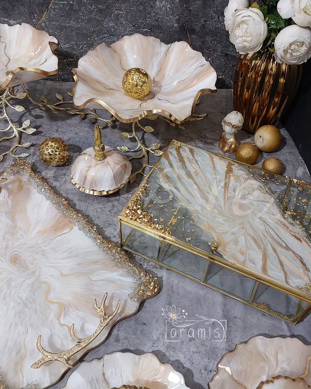 ظروف پذیرایی رزینی ماربل کرم طلایی