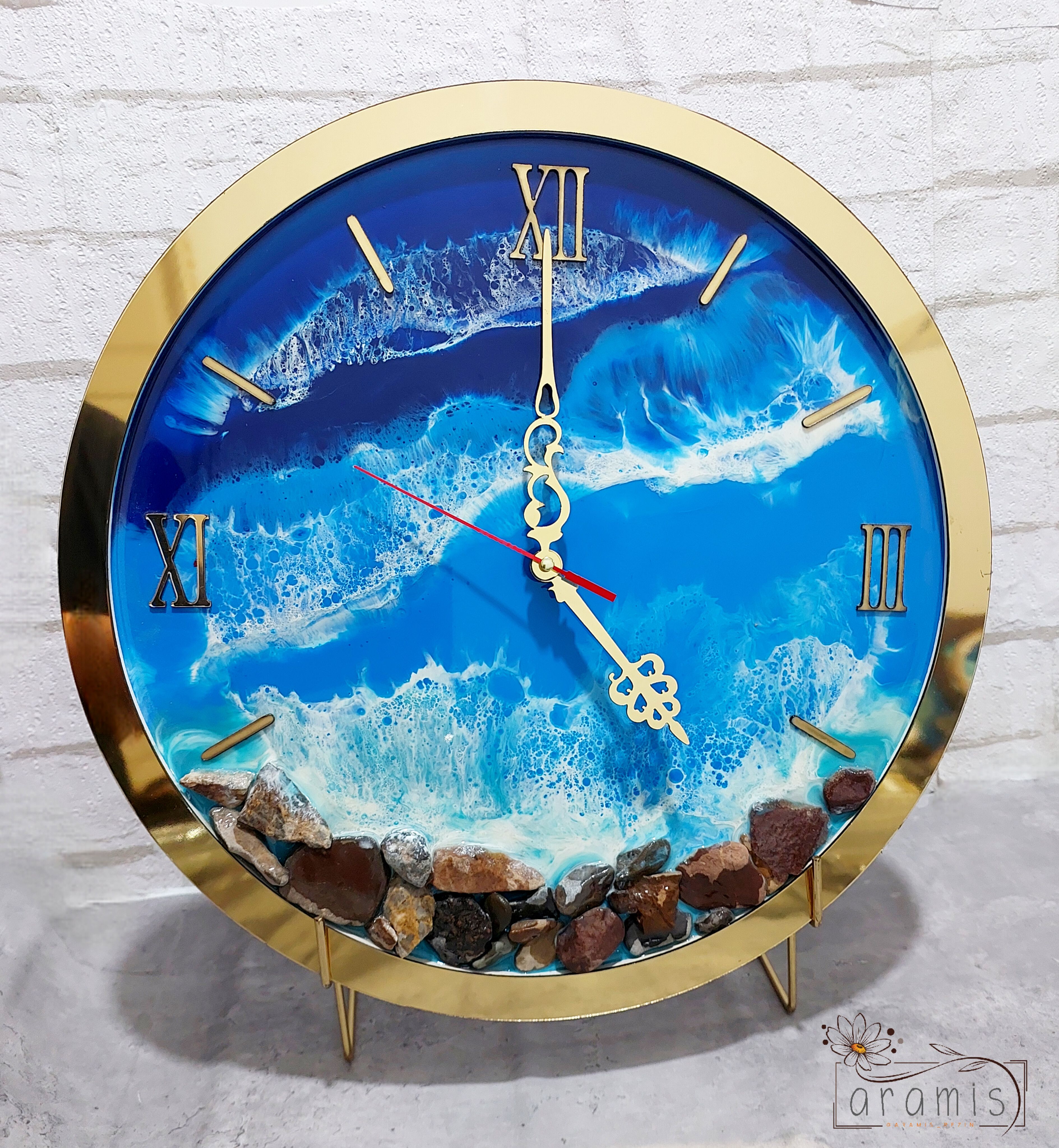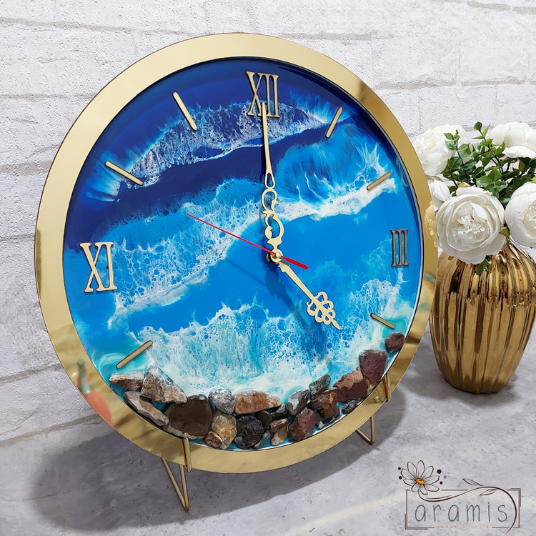 ساعت دیواری رزینی قاب طلایی طرح دریا