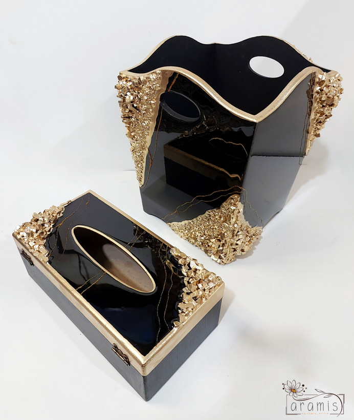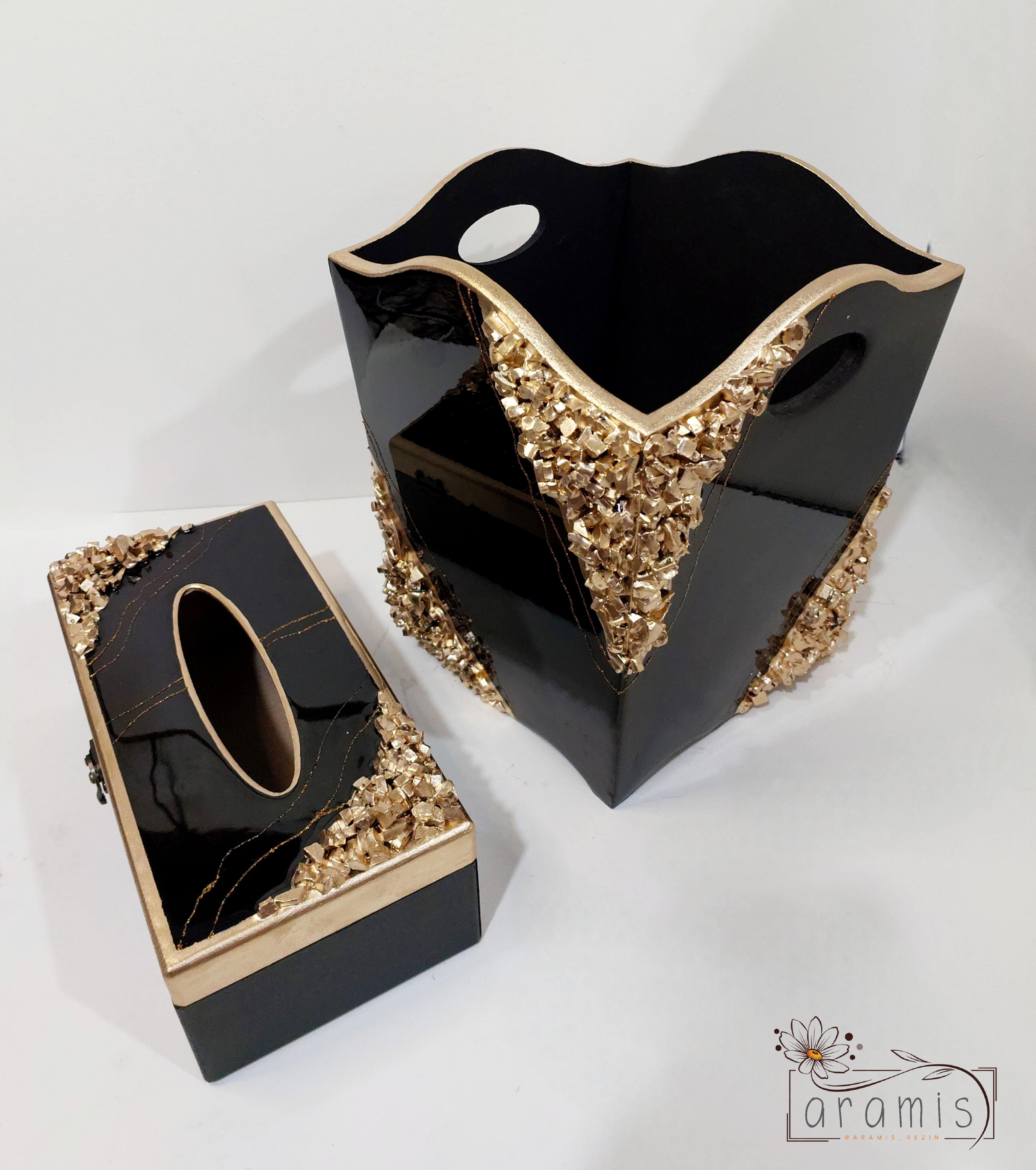 ست سطل و جعبه دستمال مشکی طلایی رزینی